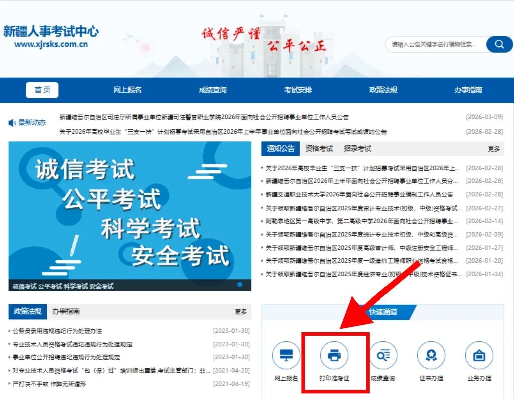 请各位考生及时登录新疆人事考试中心网站(https://www.xjrsks.com.cn),在快速通道栏目下,点击“打印准考证”,自行下载打印并妥善保管。