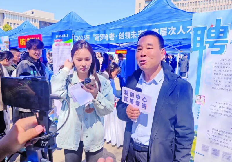 哈密市2025年“逐梦哈密·创领未来”高层次人才引进活动,河南组副组长史富强在河南工业大学双选会上做直播带岗。