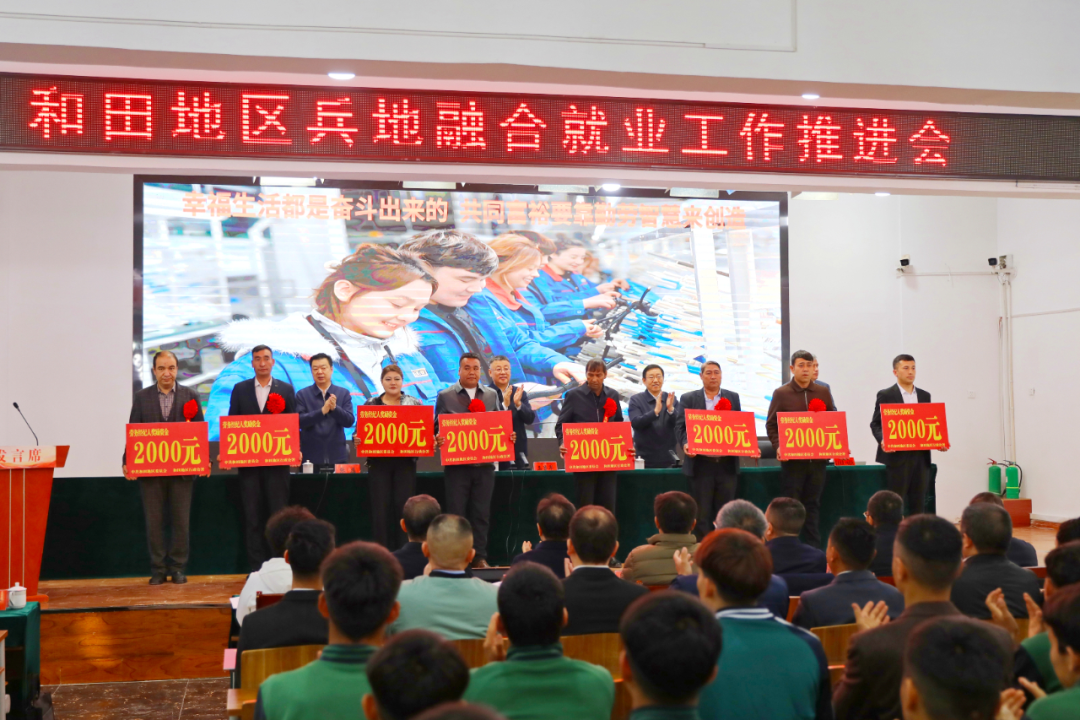 当天,和田地区兵地融合就业工作推进会在英吾斯塘村召开。企业负责人、劳务经纪人、务工人员家属交流发言,地区领导为8家企业发放补贴资金,对8名劳务经纪人进行了奖励。