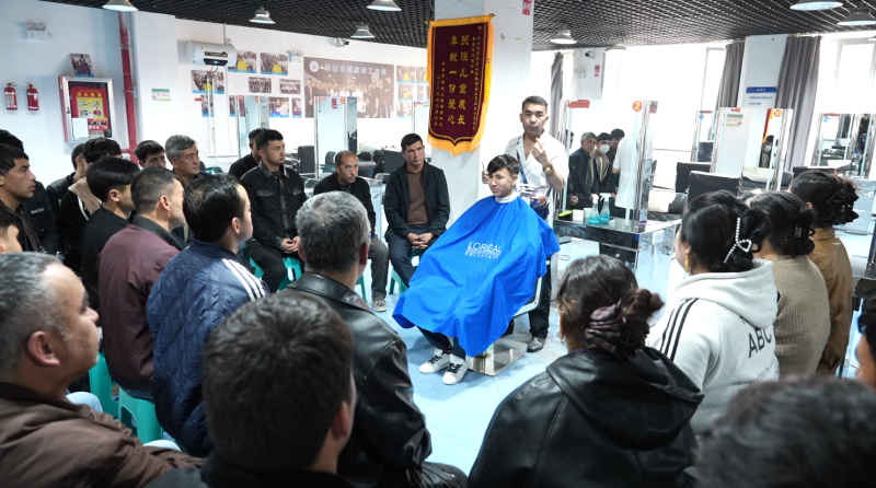 和田市技师学院老师结合实操教学,细致讲解理发技巧。