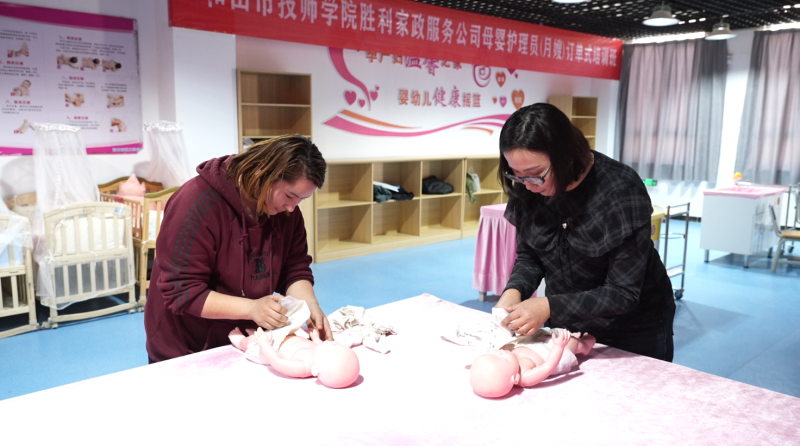 和田市技师学院母婴护理专业培训班上,学员在学习新生儿护理技能。